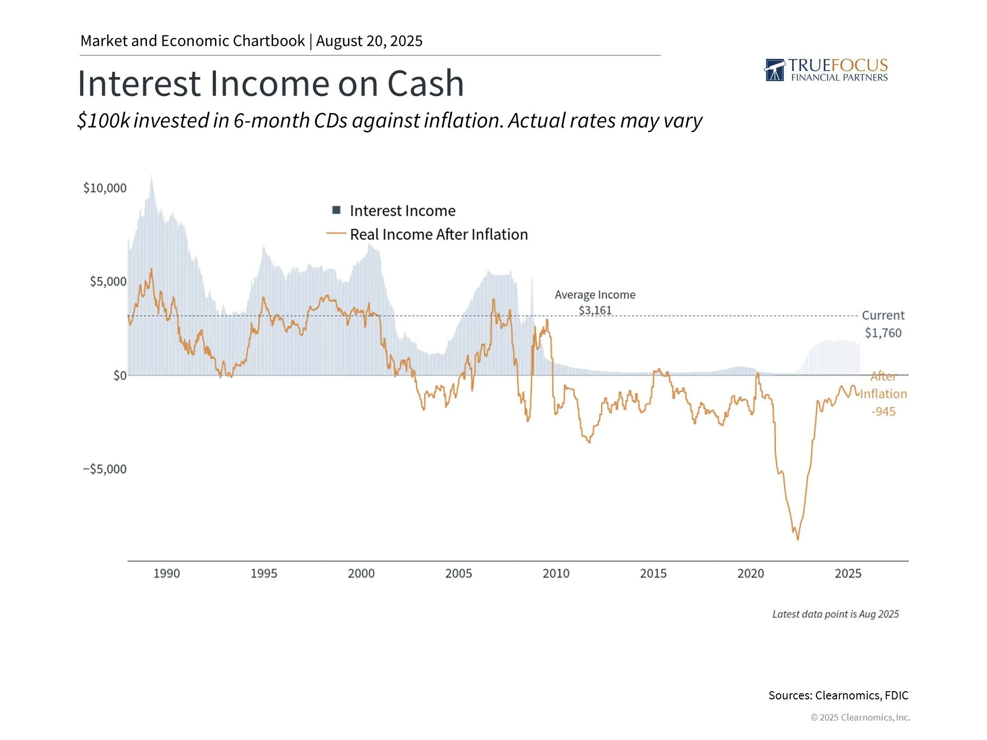 While these increases are notable, inflation is still well below the double-digit rates experienced from 2021 to 2022. However, even if tariffs do not cause sudden jumps in inflation, they may raise the average level of prices over time, eroding the value of cash. This is especially true if wage gains don’t keep up with price increases, and if investors do not have long-term asset allocations that can exceed inflation rates.