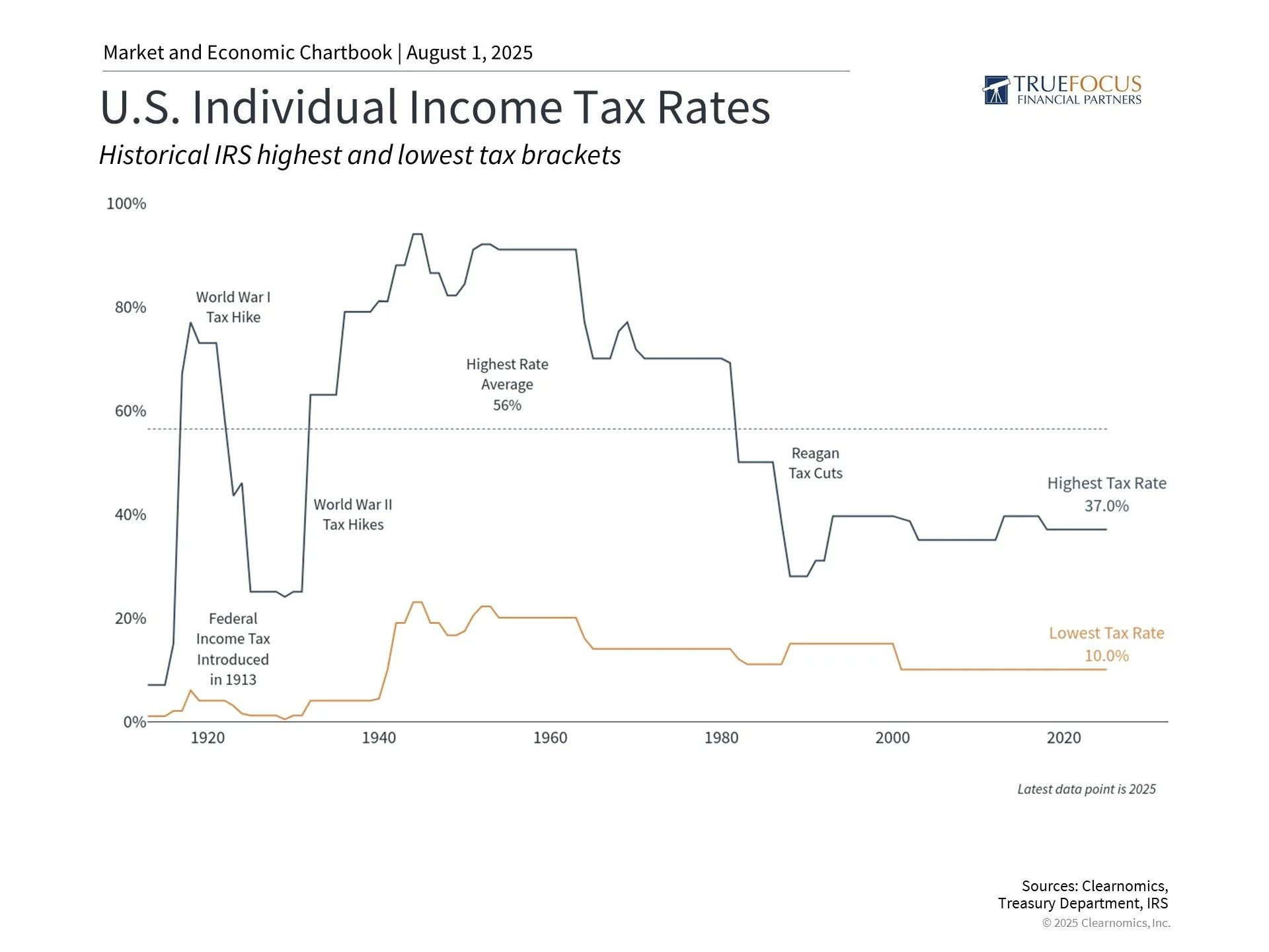 On July 4, President Trump signed a comprehensive tax and spending bill that made many provisions from the Tax Cuts and Jobs Act permanent, including current tax rates and brackets. The bill provides more certainty to investors by maintaining the current low-tax environment, but also raises concerns about the sustainability of the growing national debt.